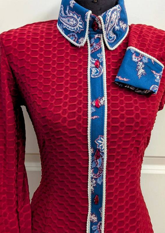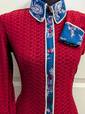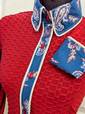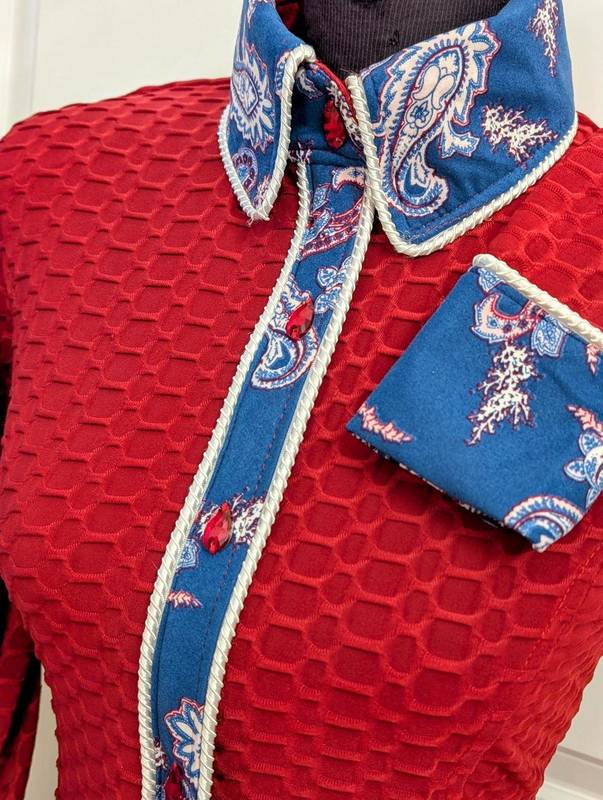 Red textured lycra hidden zip fro t with white piping and print trim on the collar, sleeves and placket. Red Buttons. Shirt does have stretch and is cool and comfortable. Great for hat weather. Hand wash and hang to dry. Made in the USA