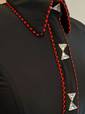 Black lycra fitted shirt with orange piping and crystal buttons. Shirt does have stretch and will not wrinkle. Cool and comfortable. Hand wash and hang to dry. Made in the USA