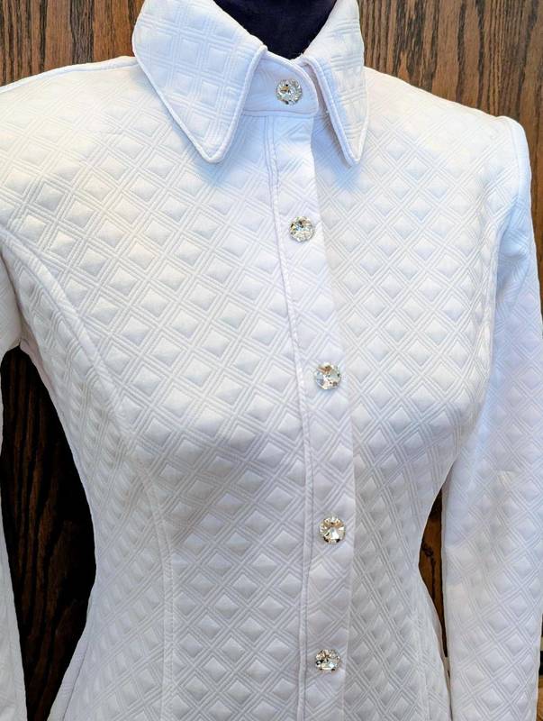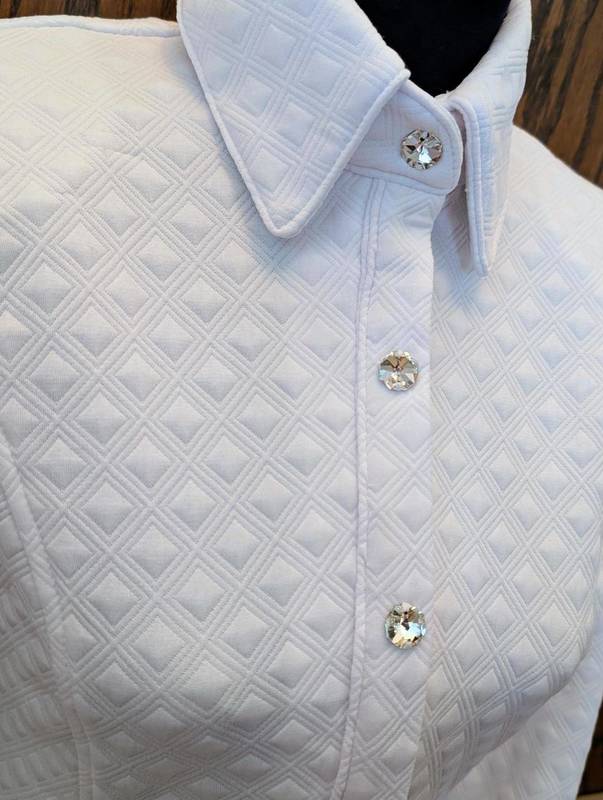 White textured lycra hidden zip front shirt. Clear crystal buttons. Shirt does have stretch and is cool and comfortable. Great for hot weather. Hand wash and hang to dry. Made in the USA